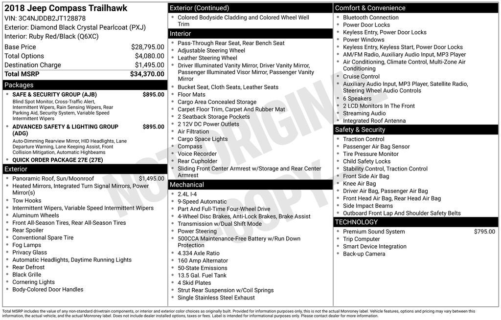 Check out our One Owner, Accident Free 2018 Jeep Compass Trailhawk 4WD presented to you in Diamond Black Crystal Pearl. Powered by a 2.4 Liter 4 Cylinder that generates 180hp matched to a 9 Speed Automatic transmission for amazing power on or off the pavement. This Four Wheel Drive SUV provides a smooth, comfortable ride with plenty of get-up-and-go while scoring excellent fuel efficiency of nearly 31mpg on the road. Skid plates accent our bold exterior, raised ride height, and distinct look.