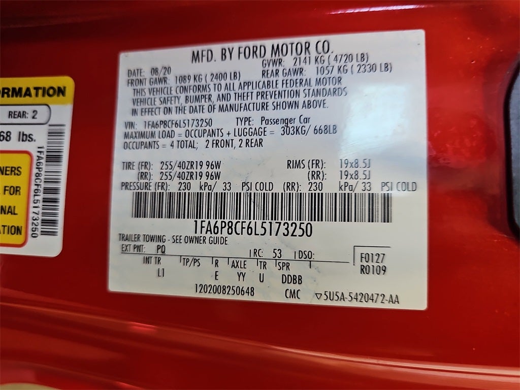 Race Red 2020 Ford Mustang GT Premium RWD 10-Speed Automatic 5.0L V8 Ti-VCT AM/FM radio: SiriusXM, Automatic temperature control, California Special Instrument Panel Applique Badge, California Special Package, California Special Script Rear Badging, Carbon Hex Aluminum Instrument Panel, Equipment Group 400A, Floor Mats w/Red Contrast Stitching, Front dual zone A/C, Leather-Trimmed Bucket Seats w/Miko Suede Inserts, Miko Suede Door Inserts w/Red Contrast Stitching, Pedestal Rear Spoiler, Power driver seat, Remote keyless entry, SiriusXM Radio, Steering wheel mounted audio controls, Unique Front Grilles w/Offset Tri-Bar Pony Logo, Wheels: 19 x 8.5 Machined-Face Aluminum.