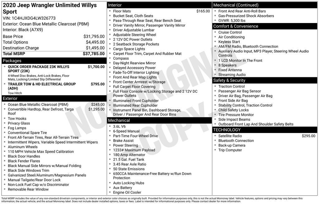 Inspired by the original from 1941, our 2020 Jeep Wrangler Unlimited 4 Door Willys 4X4 is a modern master of tough terrain that stands out in Ocean Blue Metallic! Powered by a 3.6 Liter V6 that provides 285hp paired with a fun-to-drive 6 Speed Manual transmission designed to keep the thrills right in the palm of your hand. Our iconic Four Wheel Drive SUV also sees nearly 23mpg on the highway and stands out off-road, where it delivers a legendary capability to conquer obstacles thanks to Willys upgrades like heavy-duty shocks and brakes, a limited-slip rear differential, rugged rock rails, and 17-inch alloy wheels wrapped in 32-inch mud-friendly tires, all set off by eye-catching graphics.