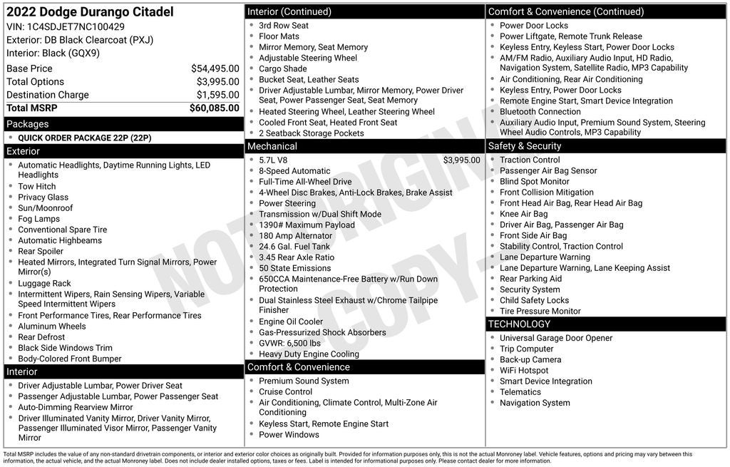 Strong and stylish, our One Owner 2022 Dodge Durango Citadel AWD is at your service in DB Black! Powered by a 5.7 Liter HEMI V8 supplying 360hp matched to a paddle-shifted 8 Speed Automatic transmission that puts your needs first. This All Wheel Drive SUV also achieves nearly 22mpg on the highway with a bold attitude and a high-end design. It's an attention-grabbing look with Durango details such as LED lighting, fog lamps, a power sunroof, a power liftgate, heated power mirrors, dual-exhaust outlets, Platinum Chrome accents, and premium alloy wheels.