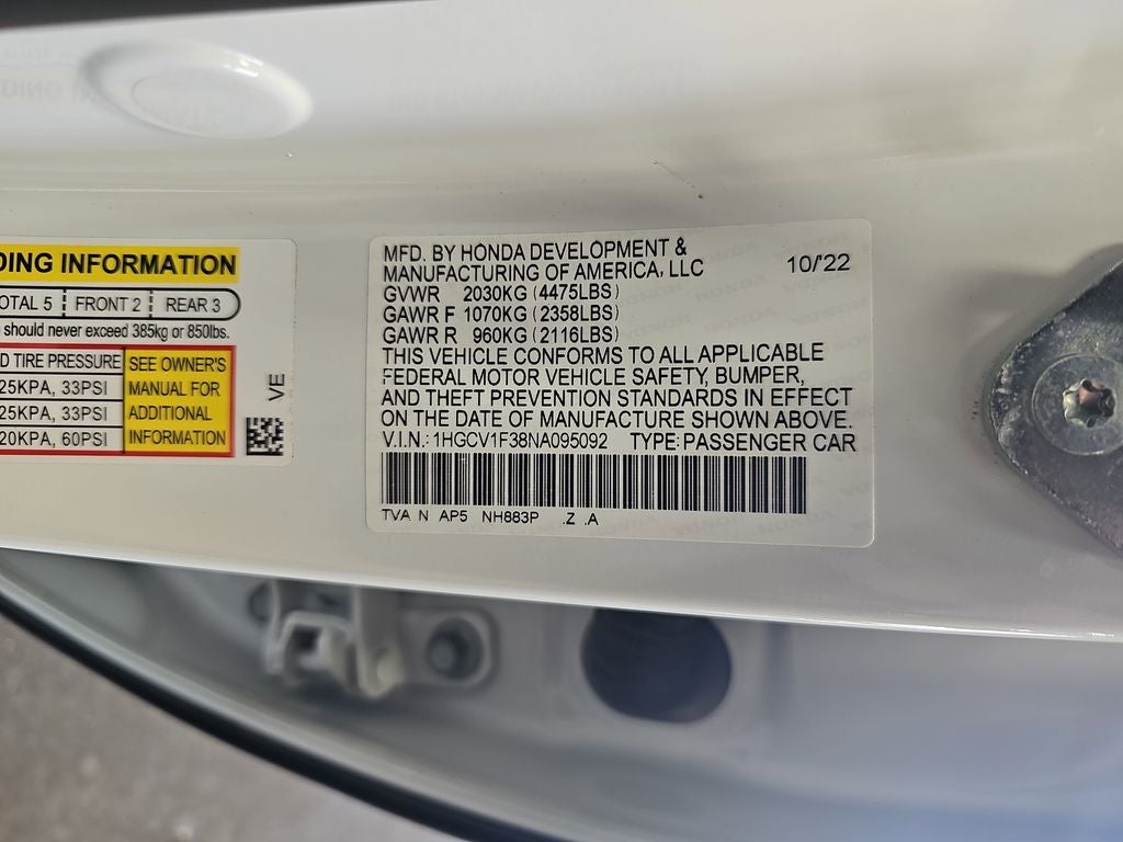 Platinum White Pearl 2022 Honda Accord Sport FWD CVT 1.5T I4 DOHC 16V Turbocharged VTEC